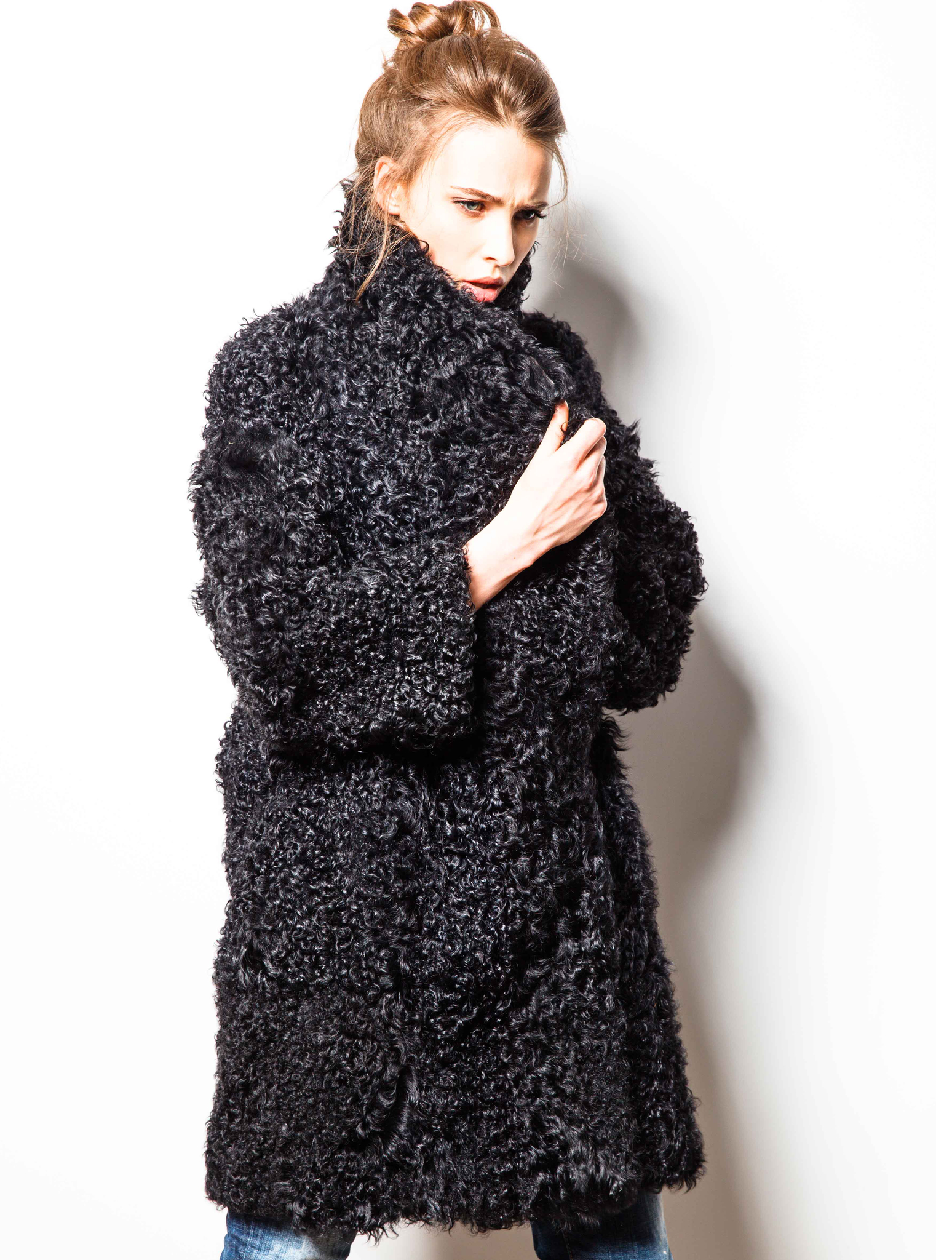 Шуба на подкладке, с карманами. Есть возможность застегнуть воротник, чтобы закрыть шею полностью.