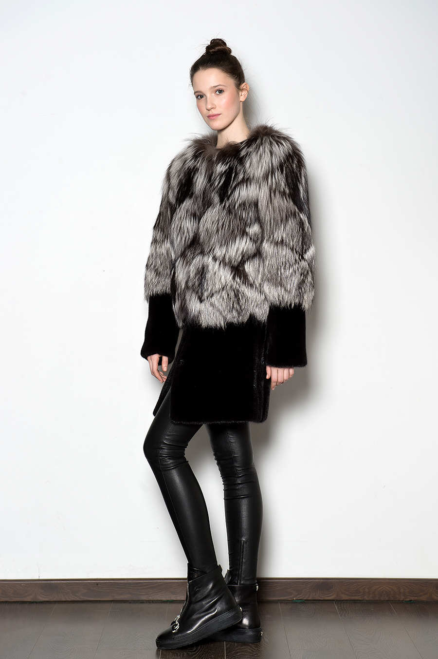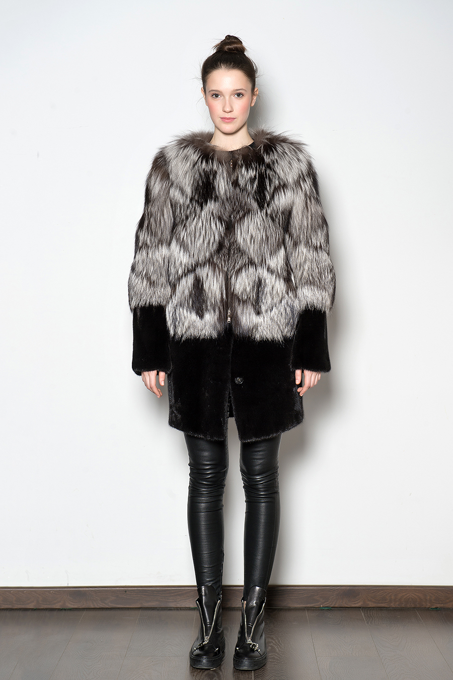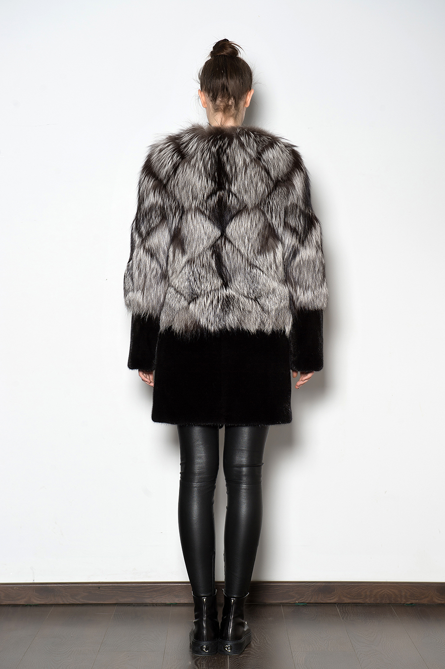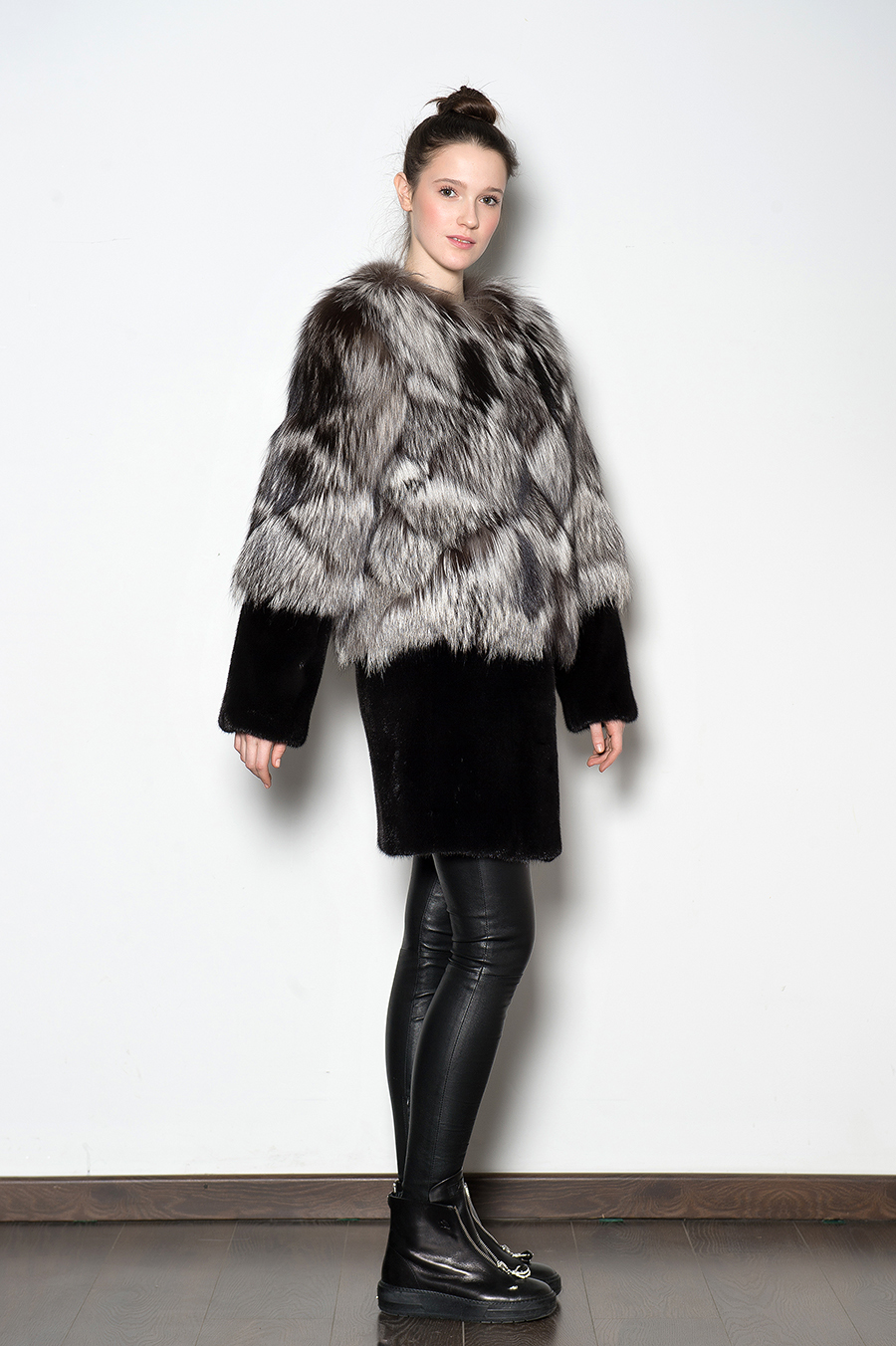 ПОЛНОЕ ОПИСАНИЕ МОДЕЛИ: Удлиненный жакет-бомбер из меха серебристой лисы и черной норки, раскладка меха лисы - ромбы, нижняя часть жакета (норка) - съемная. Полный рукав. Без воротника ( вырез под горо) Застежка - молния.